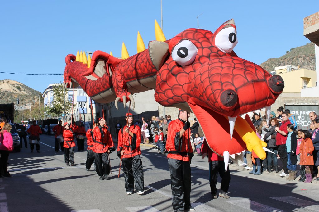 Una espléndida mañana con una temperatura muy agradable ha acompañado el desfile que ha sido seguido por cientos de personas que se han lanzado a la calle para no perderse esta fiesta. El cortejo lo abría la Banda de Tambores y Cornetas de Mazarrón a la que seguía un gran dragón chino, que ha sorprendido a los vecinos y vecinas por su originalidad y tamaño.