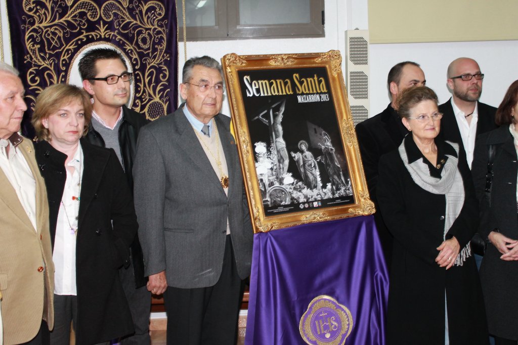 El cartel de la Semana Santa de este año muestra el paso del Calvario que desfila en la noche del Jueves Santo y que pertenece a la cofradía de Nuestro Padre Jesús Nazareno, que es la que este año organiza los actos de la Semana Santa de Mazarrón. La instantánea es obra de José Manuel Ureña, un joven fotógrafo mazarronero que ha captado el citado trono a su paso bajo el castillo de Los Vélez. Tal y como dijo el propio fotógrafo, “me llena de orgullo saber que mi cámara, mi compañera de viaje, ha sido la encargada de plasmar este momento que acompañará a los mazarroneros durante toda la Semana Santa 2013. La imagen esboza mi interés por la ‘fotografía antigua’, por ello es en blanco y negro”.