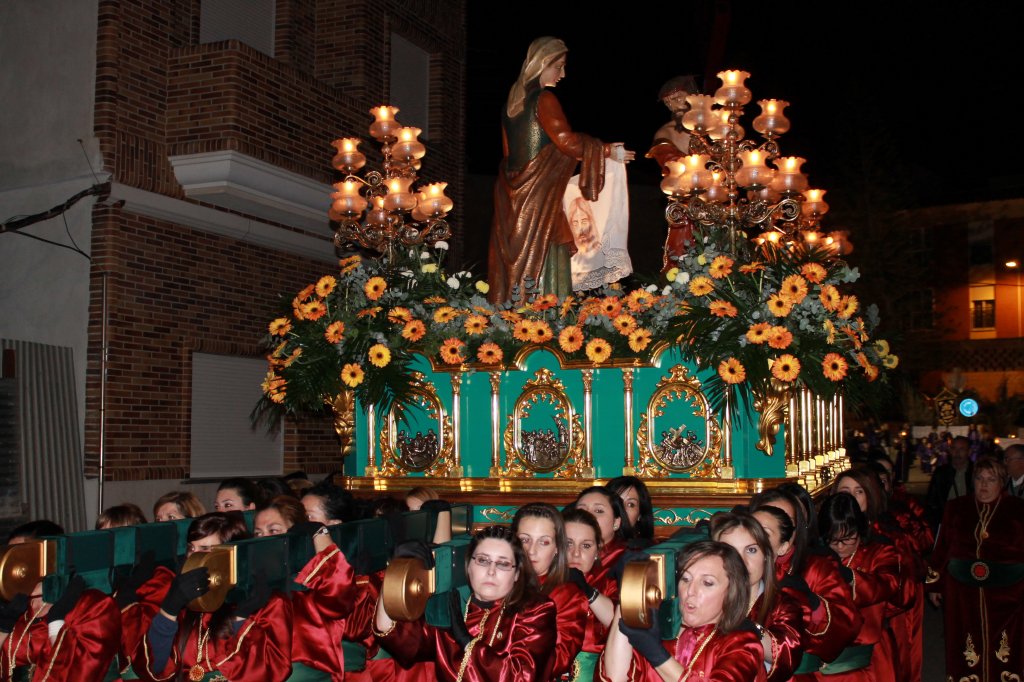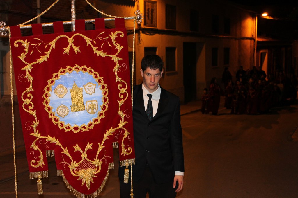 El cortejo lo abría el estandarte del Cabildo de Cofradías al que seguía la cofradía del Santo Sepulcro, que ayer sacaba dos pasos a la calle. En primer lugar, y con hábito totalmente encarnado, desfilaba La Flagelación, cuyo paso representa a Jesús atado a la columna y azotado por dos sayones. A continuación, con túnica encarnada pero con capa, capuz y fajín verde, desfilaba el paso de La Verónica, cuyo trono es portado solamente por mujeres. Ambos desfilaron con gran solemnidad y al ritmo de los tambores y cornetas que les acompañaban.