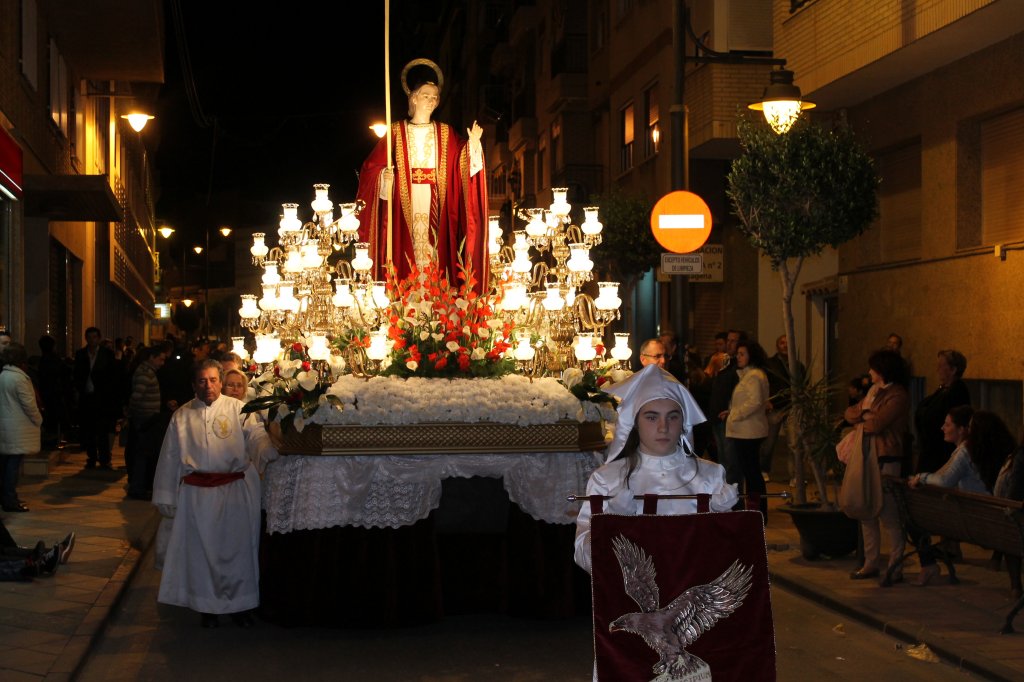 A continuación desfilaba la Cofradía de San Juan cuya imagen también había cambiado su vestimenta respecto al Jueves Santo. En esta ocasión, el apóstol preferido de Jesús vestía túnica blanca pero su capa y su fajín eran rojos. Los cofrades de este grupo vestían totalmente de blanco, pero también llevaban el fajín rojo como el apóstol. Tras ésta, desfilaba la Cofradía del Cristo del Perdón y la Virgen de Los Dolores que sacaba a la calle dos pasos precedidos por un bello estandarte que era portado por el concejal de Festejos y Policía Local, Isidro Coy.