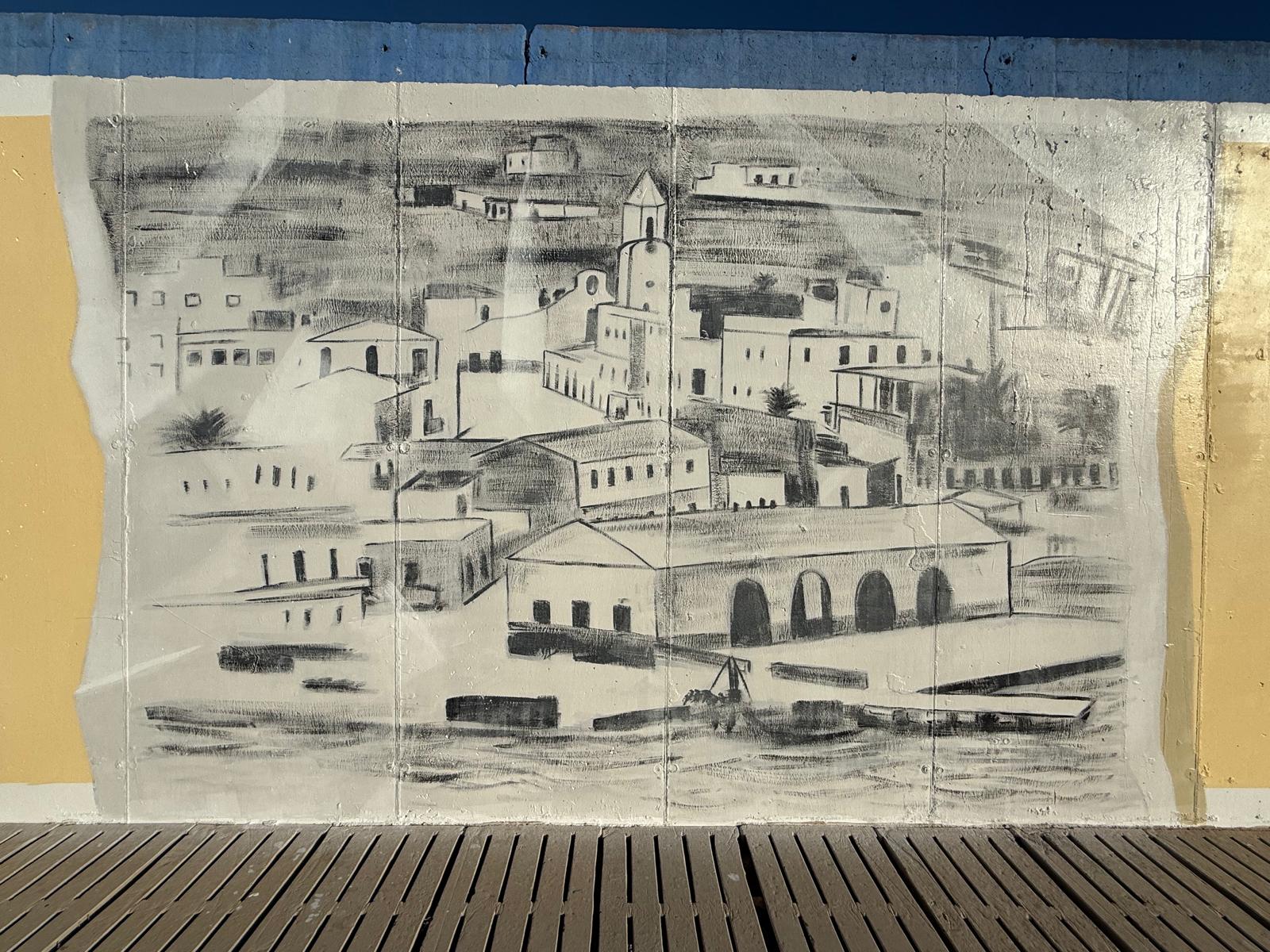 El mural, compuesto por escenas simbólicas y cargadas de memoria colectiva, representa momentos clave de la vida marinera: los orígenes del puerto, la transmisióndel oficio entre generaciones, la modernización de las embarcaciones, la participación delcolectivo pesquero en situaciones de emergencia y las fiestas populares en honor a la Virgen del Carmen.