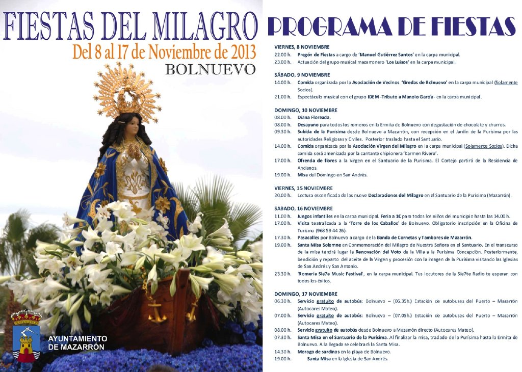 El domingo 10 de noviembre será el día en que la imagen de la Purísima Concepción que se venera en la Ermita de Bolnuevo llegue a Mazarrón. A partir de las 8 de la mañana habrá una diana floreada que recorrerá las calles de Bolnuevo y también se ofrecerá un desayuno compuesto por churros con chocolate a todos aquellos que a las 9:30 horas vayan a emprender el camino de subida con la Virgen hasta Mazarrón, donde será recibida en el jardín de ‘La Purísima’ por las autoridades religiosas y civiles sobre las 11 de la mañana. Posteriormente será trasladada a su Santuario en la plaza del Convento de Mazarrón.