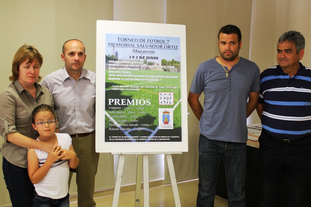 Un año más la concejalía de Deportes del Ayuntamiento de Mazarrón ha puesto en marcha el torneo de fútbol 7 Memorial “Salvador Ortiz” con el que se rinde homenaje al deportista mazarronero. La cita deportiva fue presentada por el edil delegado de Deportes, Andrés Valera, quien estuvo acompañado en dicha presentación por Miguel Ortiz, hermano de Salvador. También estuvieron presentes los padres y la prima del homenajeado que agradecieron al consistorio que se siga llevando a cabo este torneo en honor de Salvador Ortiz.