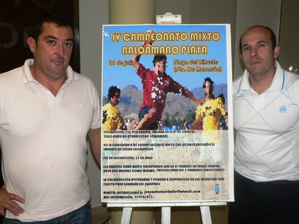 La playa del Puerto acogerá el próximo sábado 21 de julio el IV Campeonato Mixto de Balonmano Playa que se disputará a partir de las 11 de la mañana en las categorías Cadete, Juvenil y Sénior. El torneo fue presentado ayer por Andrés Valera, concejal de Deportes del Ayuntamiento de Mazarrón, y Juan Antonio Rebollo, representante del Club Balonmano Mazarrón. Ambos coincidieron en destacar “la espectacularidad de este campeonato por resultar más complicado de jugar que el balonmano tradicional”.