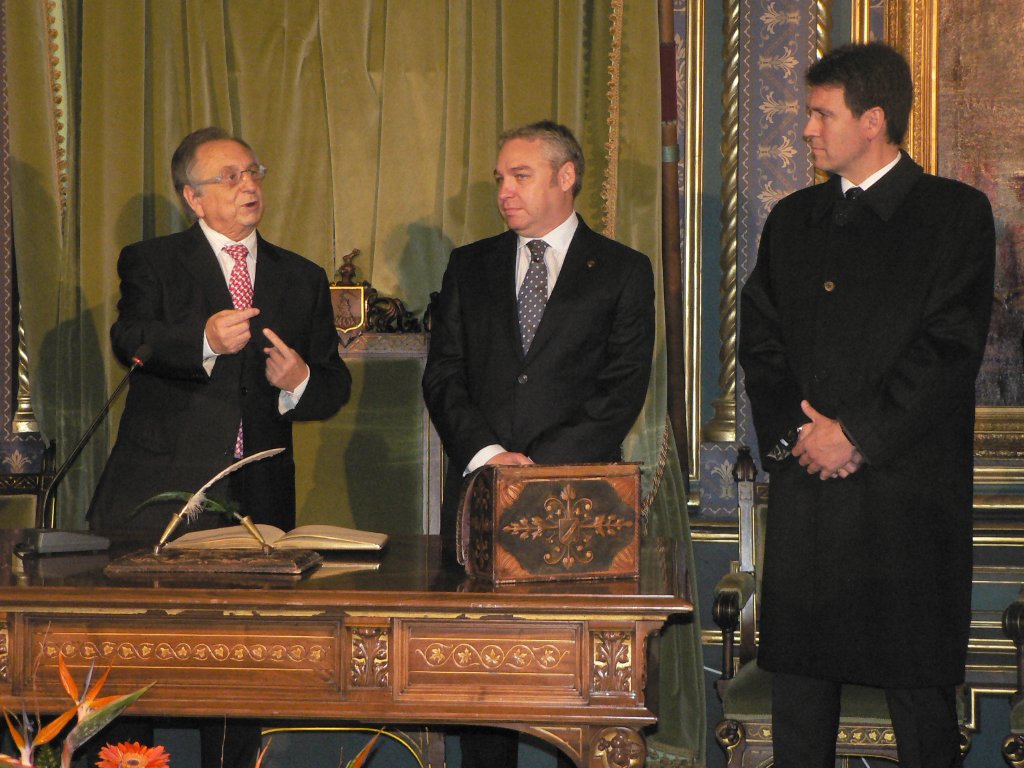 Antes del pregón, el empresario fue recibido en las Casas Consistoriales por el Alcalde de Mazarrón, Ginés Campillo, y el concejal de Festejos, Isidro Coy. Tomás Fuertes firmó en el libro de honor del Ayuntamiento tras conocer al resto del equipo de gobierno y a varios concejales de la oposición que le esperaban en el Salón de Plenos del emblemático inmueble. Al finalizar su firma se dirigió a los presentes destacando la juventud de la mayoría de la corporación, a los que dirigió algunos consejos “para que no interpongáis los intereses personales a las necesidades de Mazarrón”, haciendo un símil entre el municipio y su propia empresa. En este acto también estuvo presente el alcalde de Alhama de Murcia, Alfonso Fernando Cerón.